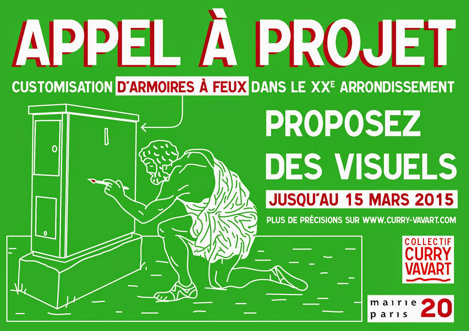 En partenariat avec la Mairie du XXe arrondissement, le collectif Curry Vavart propose aux artistes street art d'intervenir sur les armoires à feux du XXe arrondissement. Toutes les informations et les modalités sur l'affiche.